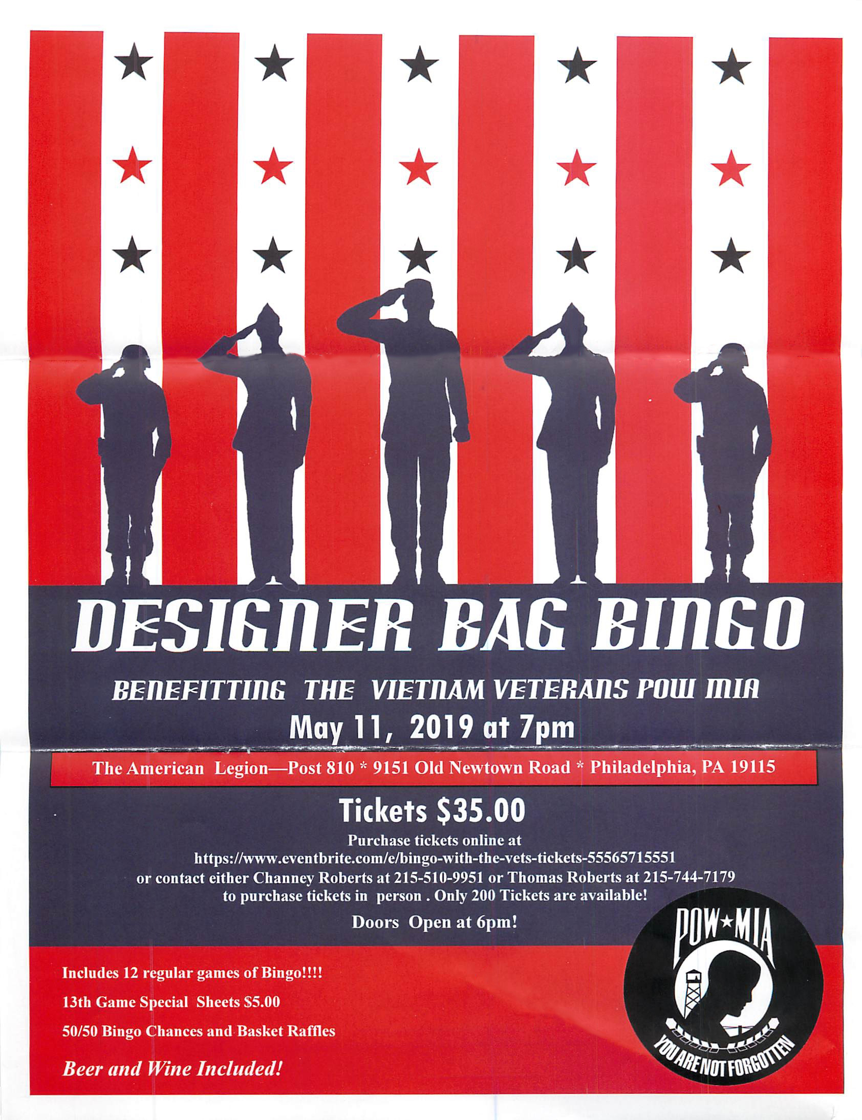 The popular game will be held on Saturday, May 11 at 7 p.m. at the American Legion Post 810. Offered are 12 games of Bingo, 50/50 chances and a raffle. Prizes include designer handbags. Admission is $35 and can be purchased online at www.eventbrite.com/e/bingo-with-the-vets-tickets-55565715551 . They also can be purchased from Channey Roberts by calling 215-510-9951 or Tom Roberts at 215-744-7179. There are only 200 tickets. More info on the flyer. Tom, a member of the POW/MIA Committee, and Channey are organizing the event. Please spread the word.