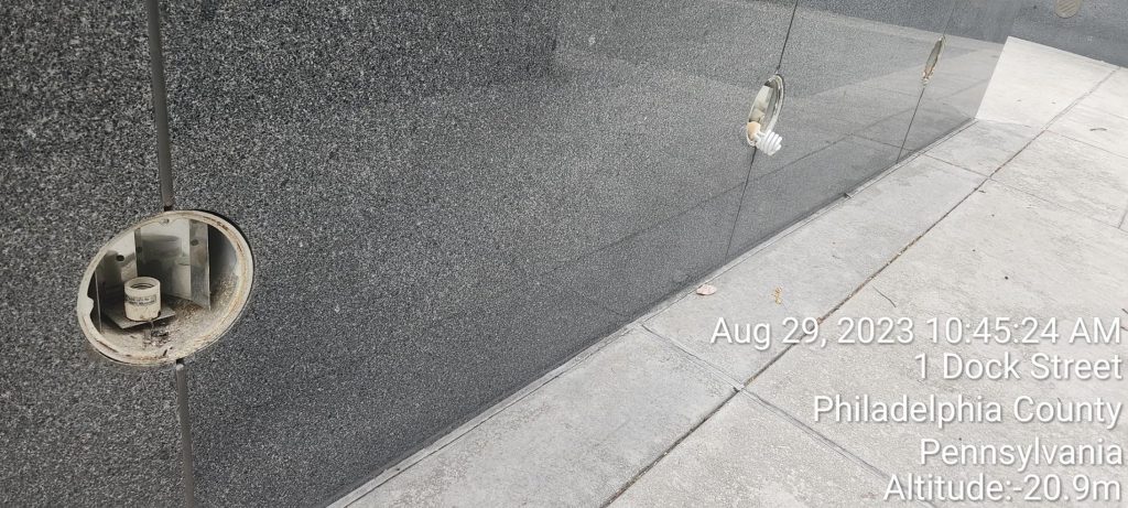 1. Approx. 20 “Star” skate stoppers in different areas have been pried off marble in different areas.